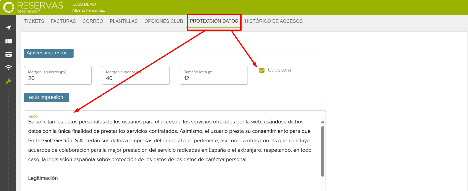 En el apartado “Texto Impresión”, deberás pegar y/o redactar el aviso legal de protección de datos que se imprimirá.
